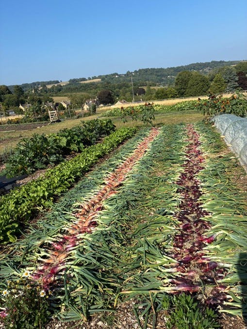 One unexpected highlight has been the onions. We tried three types this year: Red Baron, Long Red Florence, and shallots. They were multi-sown through a weed membrane to suppress unwanted growth and hold moisture. By July, they were swelling beautifully. Some of them are monsters. The time to harvest is close when the green tops start to flop over. When we see this, we push all the tops over to help speed up the finishing process.  A week later, we pulled them and laid them out in the sun for a few days before they were laid out on a stack of pallets in a barn that is cool, dark and dry. Where there’s now barely a square inch left unoccupied by onions. I’ve even had to leave a whole bed in the ground to dry naturally because we’ve run out of space. A problem I’m happy to have.